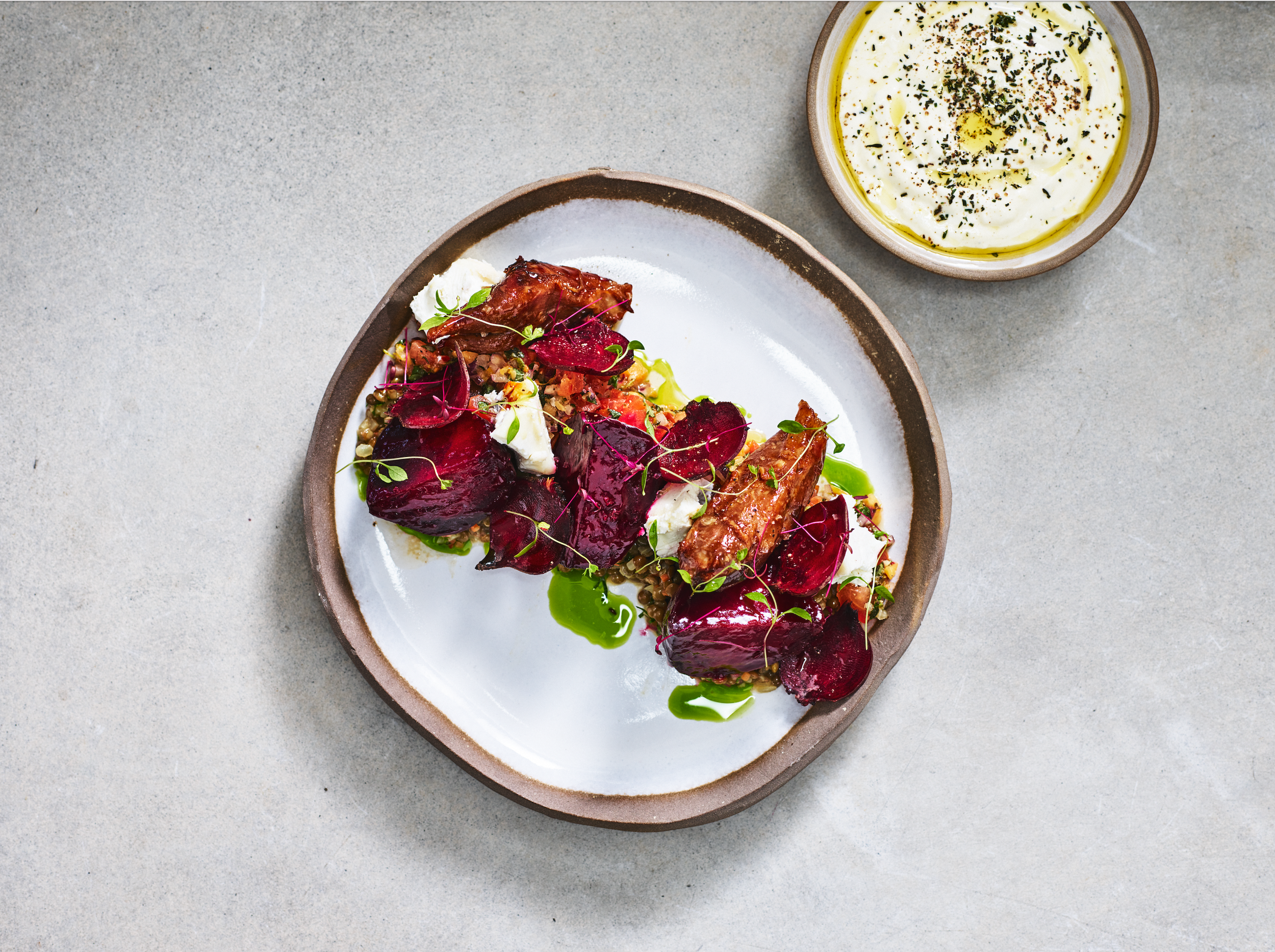med saltbakad rödbeta, getost, rostad vitlök och citronglaserade gröna linser